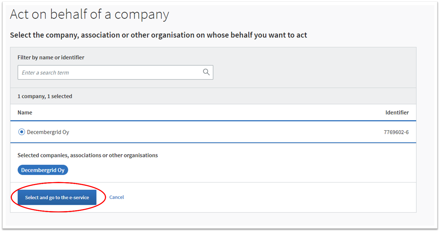 3. Select the organisation on whose behalf you are acting in the Finnish Transparency Register. Then click the “Select and go to the e-service” button.