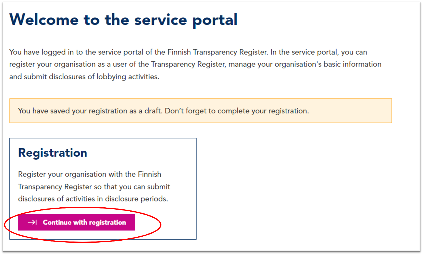3. Any of the individuals authorised by the organisation may continue the registration in the Finnish Transparency Register.