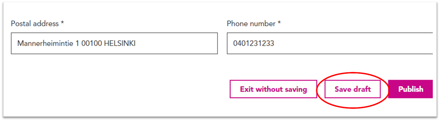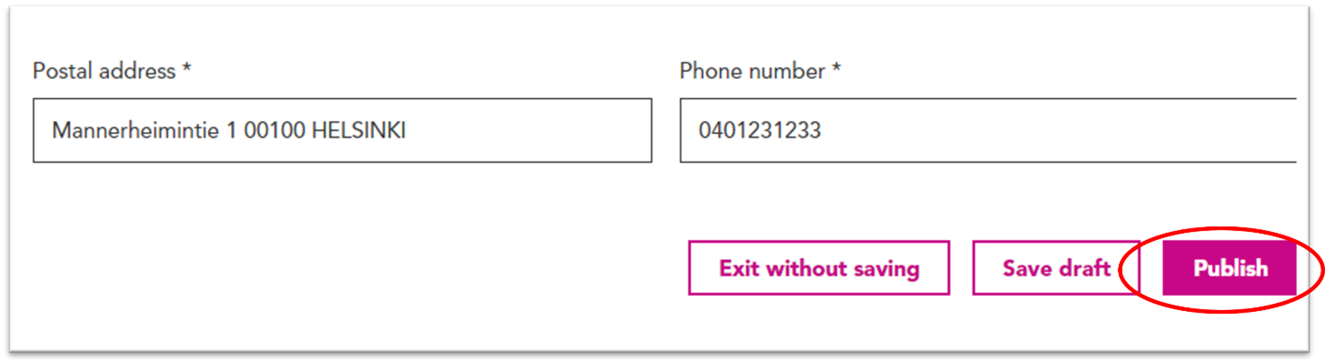6. Once you have filled out all information marked with an asterisk, you can publish the registration by clicking the “Publish” button at the bottom of the page. The information contained in the registration, with the exception of contact details, is published immediately on the transparencyregister.fi website. The discloser is responsible for the accuracy of the information.