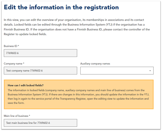 Note: The basic information from the Business Information System cannot be updated in the Finnish Transparency Register. Update them in the Business Information System service and then return to the Finnish Transparency Register. The updated information is shown when you open the registration form again for editing.