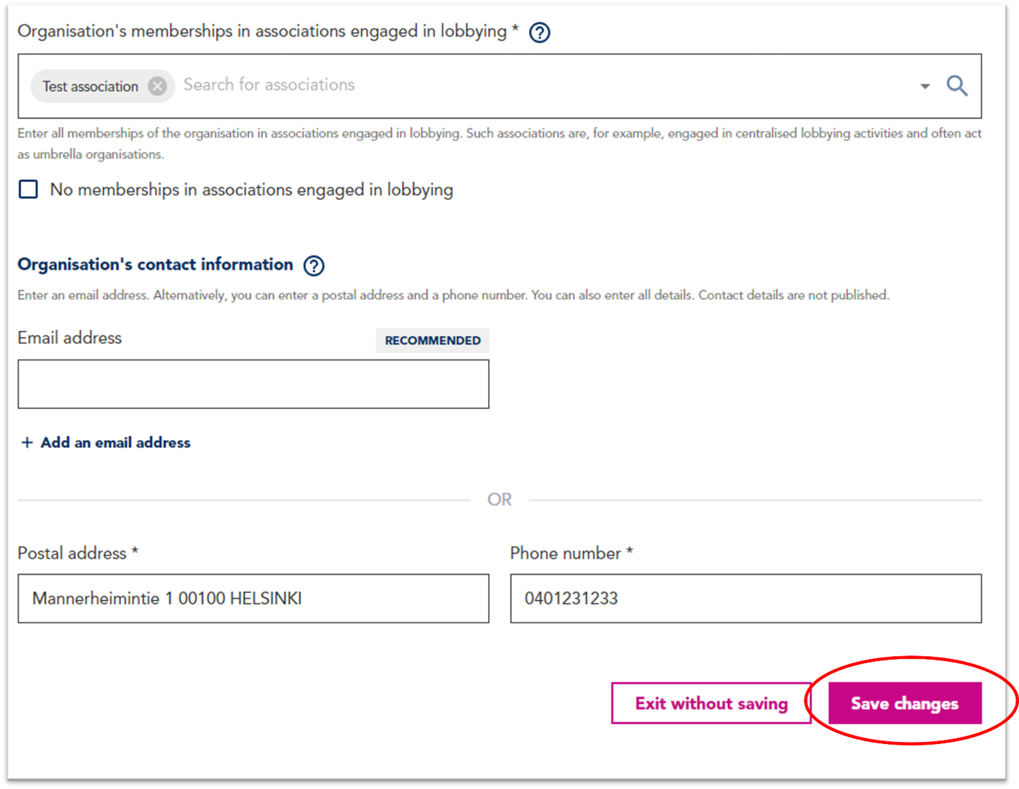 We recommend that you provide at least one email address so that we can send you an acknowledgement of a successful registration and a reminder message about the opening of the disclosure period and submitting a disclosure of activities. You can include up to four email addresses to the registration by clicking “Add new”. We recommend that you provide the email addresses of the persons responsible for using the Finnish Transparency Register in your organisation.