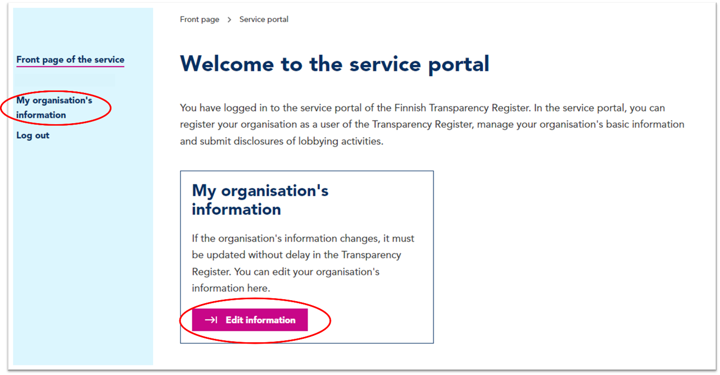 2. If you just want to view the information, click the “My organisation’s information” on the left panel. If you want to directly move on to edit the information, click the “Edit information” button in the box on the front page of the service portal.