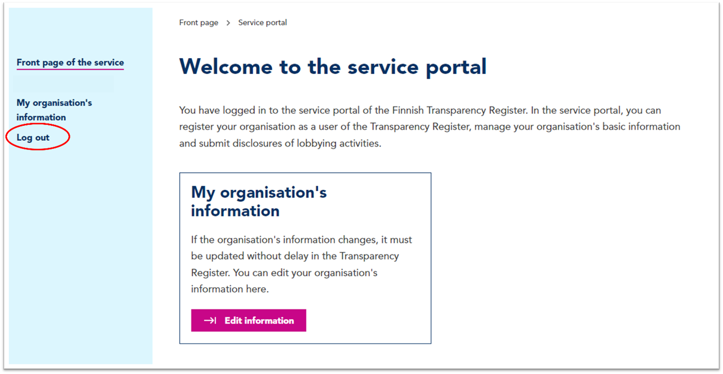 2. You can log out of the Finnish Transparency Register.