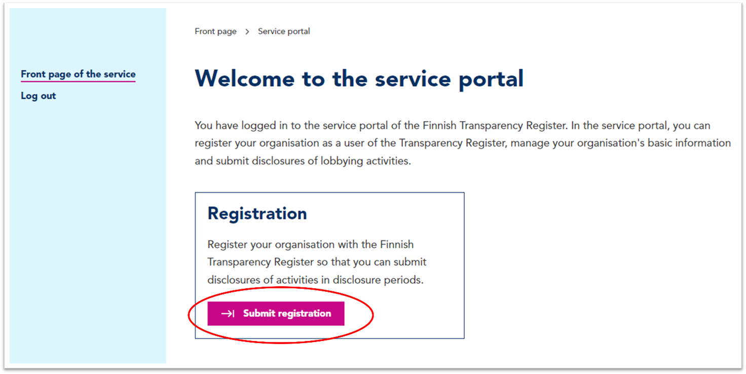 The use of the Transparency Register begins by submitting a registration disclosure. Submit registration using the service portal of the Finnish Transparency Register. Log in to the portal using your personal IDs. The person submitting the registration also needs authorisation to act on behalf of the organisation. Instructions for foreign organisations are provided at the bottom of this page.