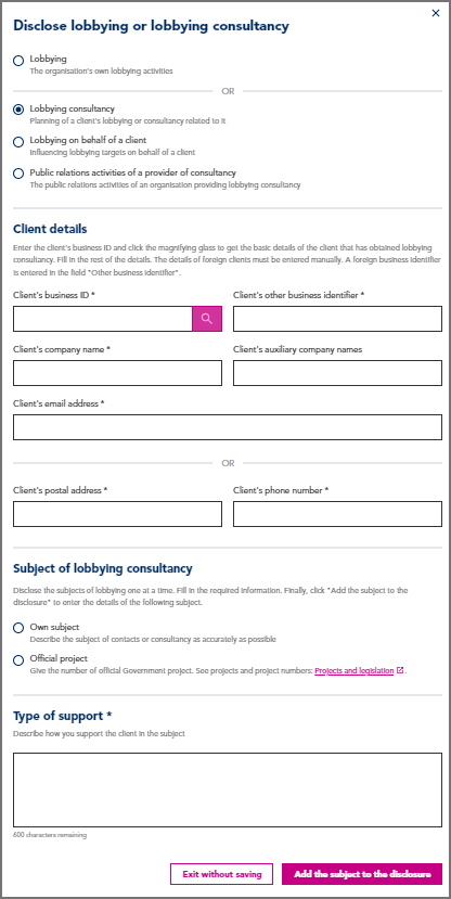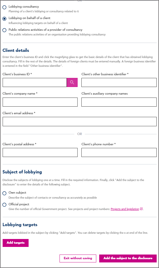 2. This opens a form on which you can disclose the subjects of lobbying, one by one. Start by determining the type of your activities (lobbying, lobbying consultancy, lobbying on behalf of a client, or public relations activities of a provider of consultancy).