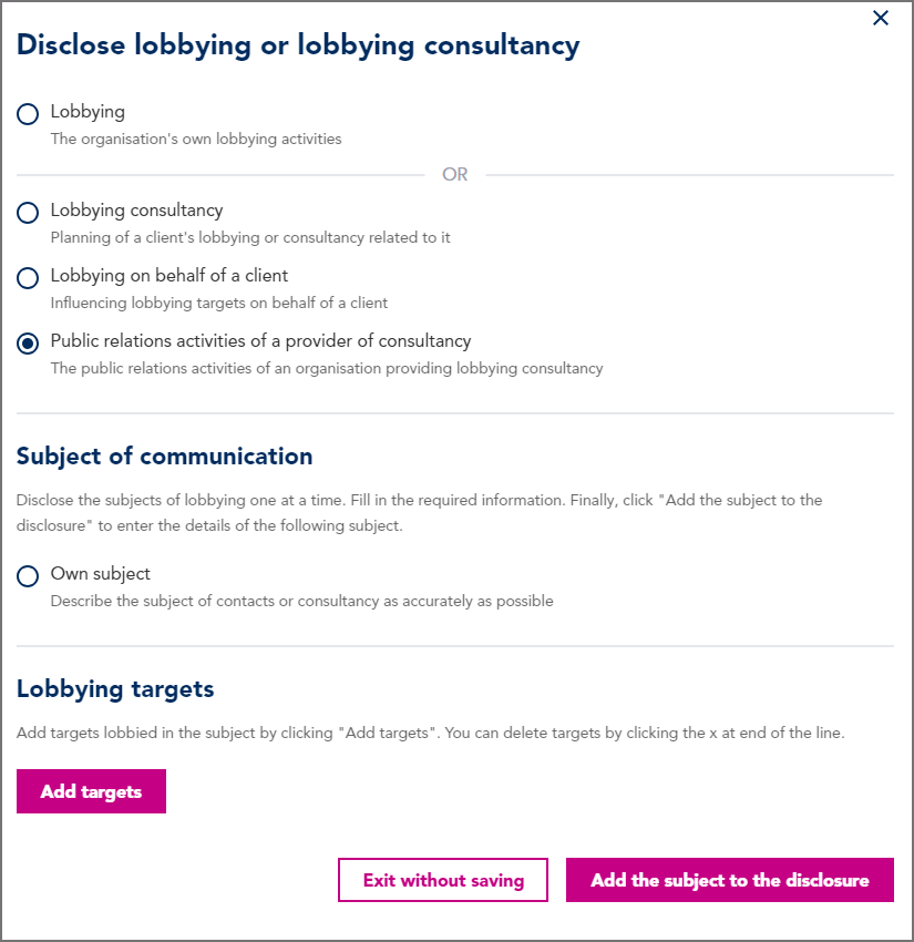 In the case of the lobbying consultancy provider's own public relations activities, a free-form description of the subject is always given. The subject of the organisation's own public relations activities should describe the content of the activities.