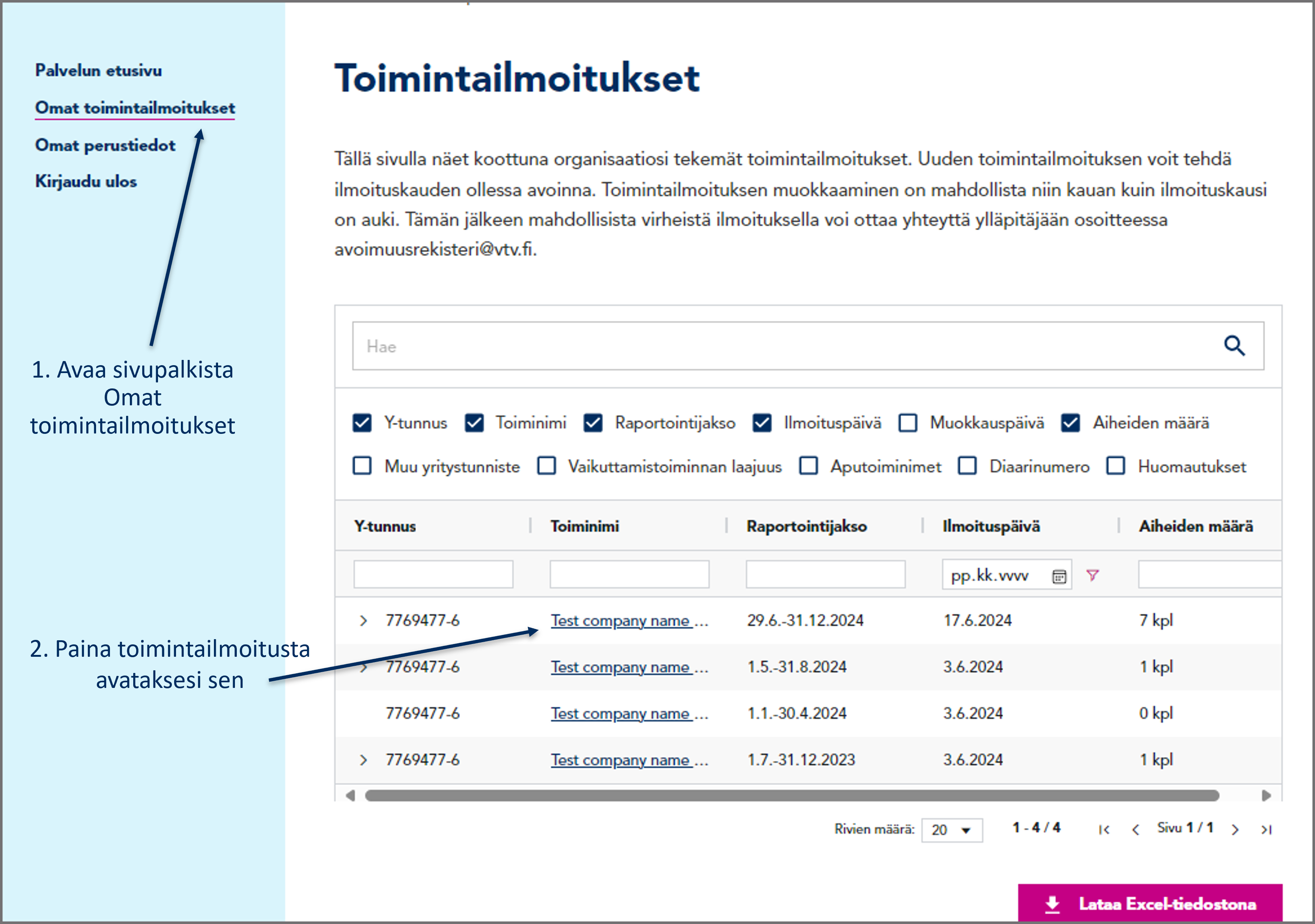 3. Jos huomaat virheen tai puutteen, voit vapaasti muokata toimintailmoitusta niin kauan kuin ilmoituskausi on auki. Ilmoituskauden sulkeutumisen jälkeen huomatuista muutostarpeista voi ilmoittaa rekisterinpitäjälle osoitteeseen avoimuusrekisteri@vtv.fi.