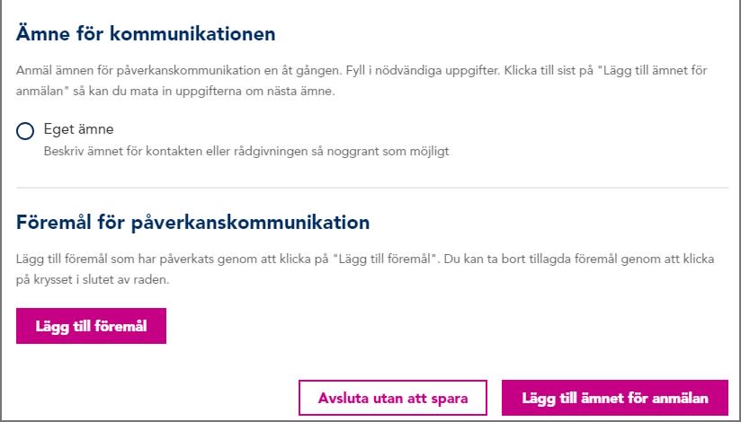I fråga om påverkanskommunikation för en klients räkning och organisationens egen PR-verksamhet ska du uppge de föremål för påverkanskommunikation som har kontaktats. I fråga om ämnet ska du uppge alla personer som utgör föremål för påverkan samt kontaktsätten.